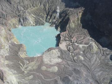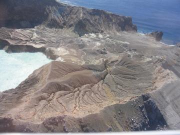 | The acid lake at the centre of White Island is clearly visible. There is continuous eruption of steam from a vent under the top right-hand corner of the lake. The temperature of the lake is about 90 degrees Celsius. Geologists used to get water samples from the lake by having a helicopter hover over the lake while they dropped a glass bottle down to collect their sample. The helicopter pilots no longer do this. The hightly acidic steam from the lake was eating away at the metal on the underside of the helicopters. | ![]() |