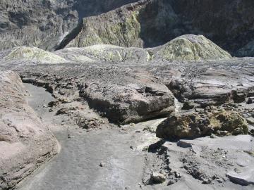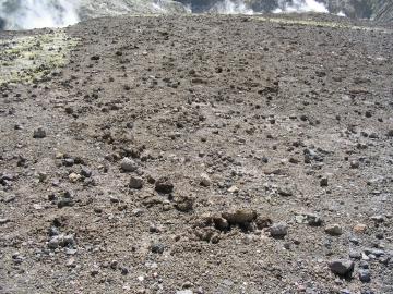 Another view of the crater floor. Here the ground is covered with rocks thrown out of the vent during recent eruptions. |