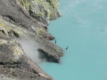 | I visited this volcano six weeks after a geological survey was done of the island. Geologists surveyed the crater, and placed markers at one meter elevations starting at the existing level of the lake surface. During those six weeks the level of the lake has risen more than 12 meters. Geologists studying the island have set up an informal betting pool. The most common prediction for a major eruption is August of 2004. | ![]() |