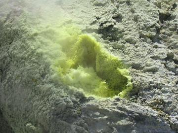 | Fumaroles or steam vents are common on the island. In many cases they are surrounded by sulphur crystals. | ![]() |