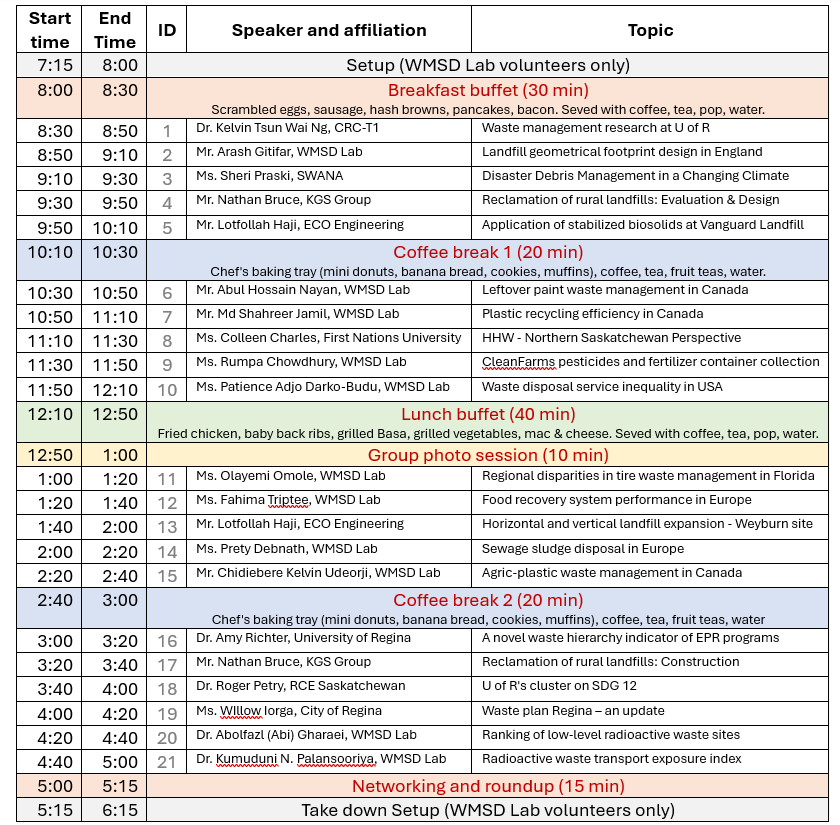 The symposium topics include the generation, collection, treatment, recycling, and disposal of (i) municipal solid waste, (ii) plastic waste, (iii) electronic waste, (iv) industrial waste, (v) construction and demolition wastes, as well as (vi) special wastes such as household hazardous waste and low-level radioactive waste. The objectives of this in-person symposium are to raise public awareness on sustainable solid waste management in Canada, present waste management research at UofR, and build a regional network with regulators, engineers, urban planners, NGOs, and grassroots organizations in Southern Saskatchewan.