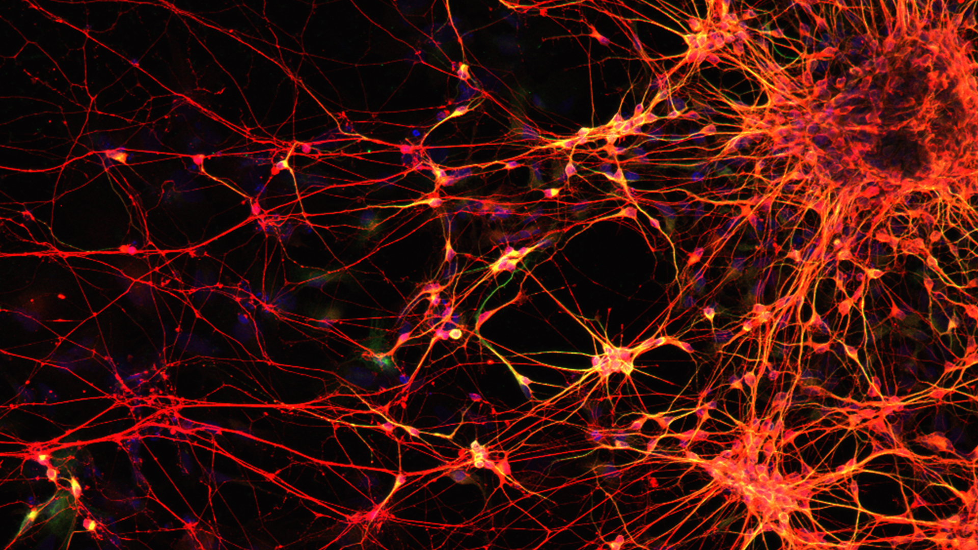 Neurons control every regulatory process in our bodies through electrical and chemical signals, relying on mitochondria for energy. When mitochondria are malfunctioning, they contribute to neuronal dysfunction and neurodegenerative diseases, among them autosomal recessive spastic ataxia of Charlevoix-Saguenay, a rare genetic disorder that affects movement and coordination. Learning more about neuronal dysfunction is key to developing treatments. This micrograph shows motor neurons derived from iPSCs (induced pluripotent stem cells), cells taken from a patient and reprogrammed into neural cells. Three fluorescent markers highlight key structures—the nuclei (blue), axons (red) and dendrites (green)—and create a captivating sunset-like pattern. However, like a sunset fades into night, patients with this disorder will eventually lose their motor neurons to the cover of darkness. By studying patient-derived neurons, I aim to uncover the mechanisms behind neurodegeneration, paving the way for potential treatments.