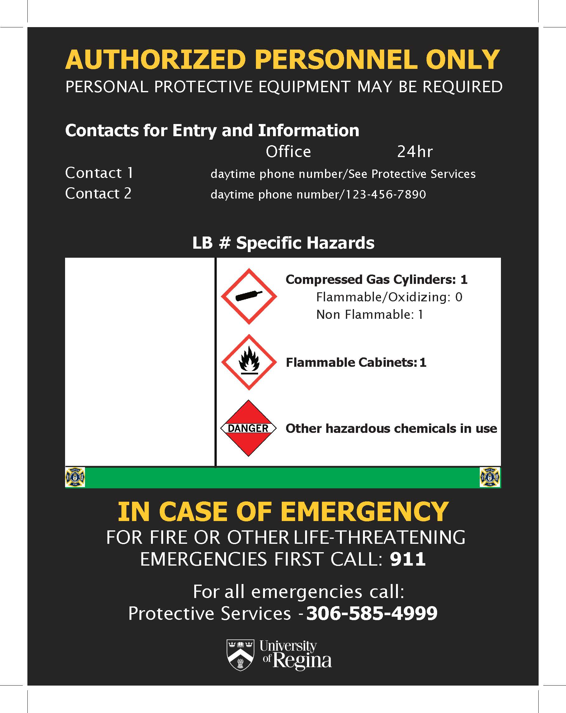 The laboratory requires contact persons that are responsible for the area, knowledgeable of the hazards within, capable of authorizing entry, and advising those entering of any relevant hazard to their occupancy/work, as well as how to appropriately protect themselves. The contact information may contain the office contact information and/or a 24-hour contact. In case of non-life-threatening emergencies, contact Protective Services, as they have emergency contacts for laboratory contact persons.