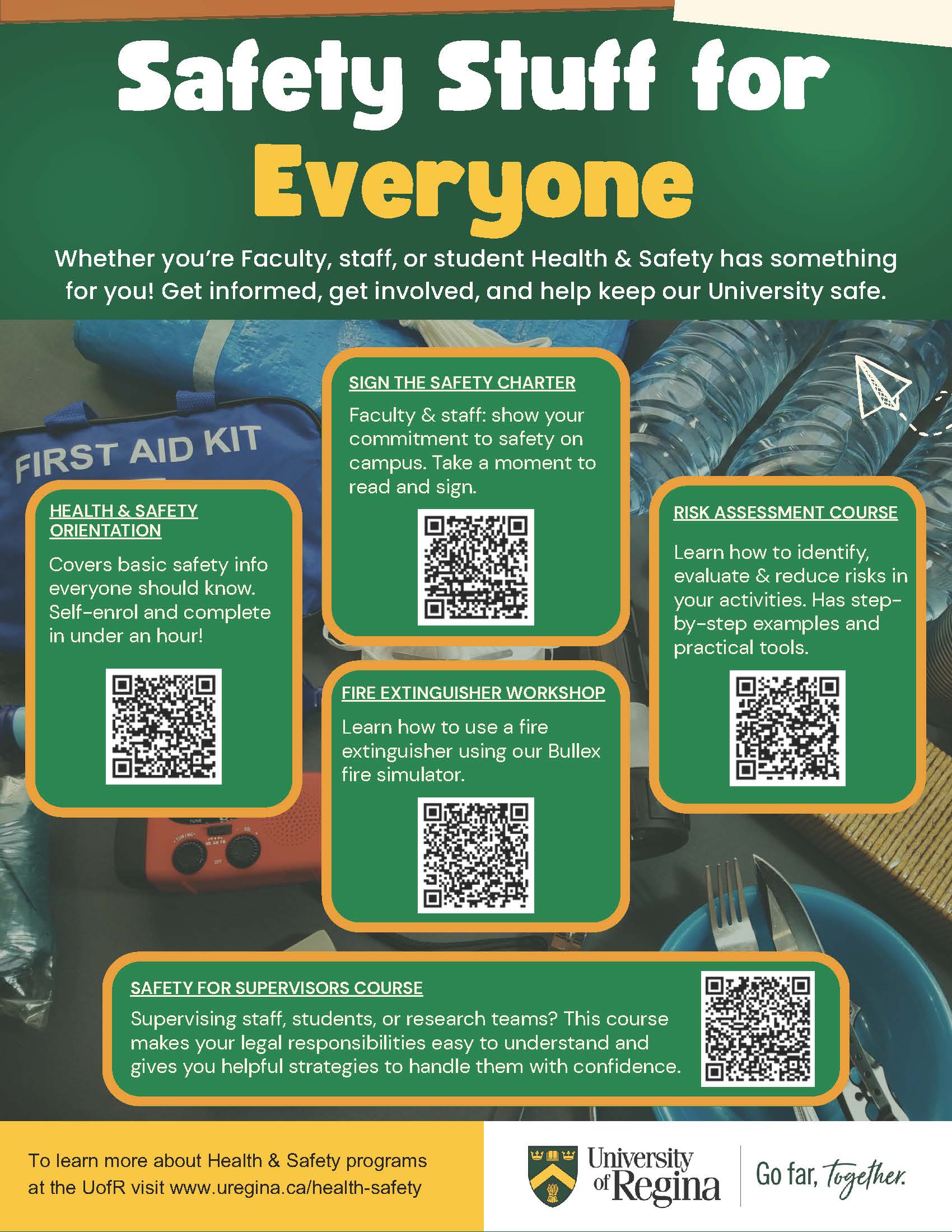 Clickable link and QR code for easy access to five popular resources - Safety Charter, Health & Safety Orientation course (UR Courses), Risk Assessment course (UR Courses), Fire Extinguisher workshops, and the Safety for Supervisors course.