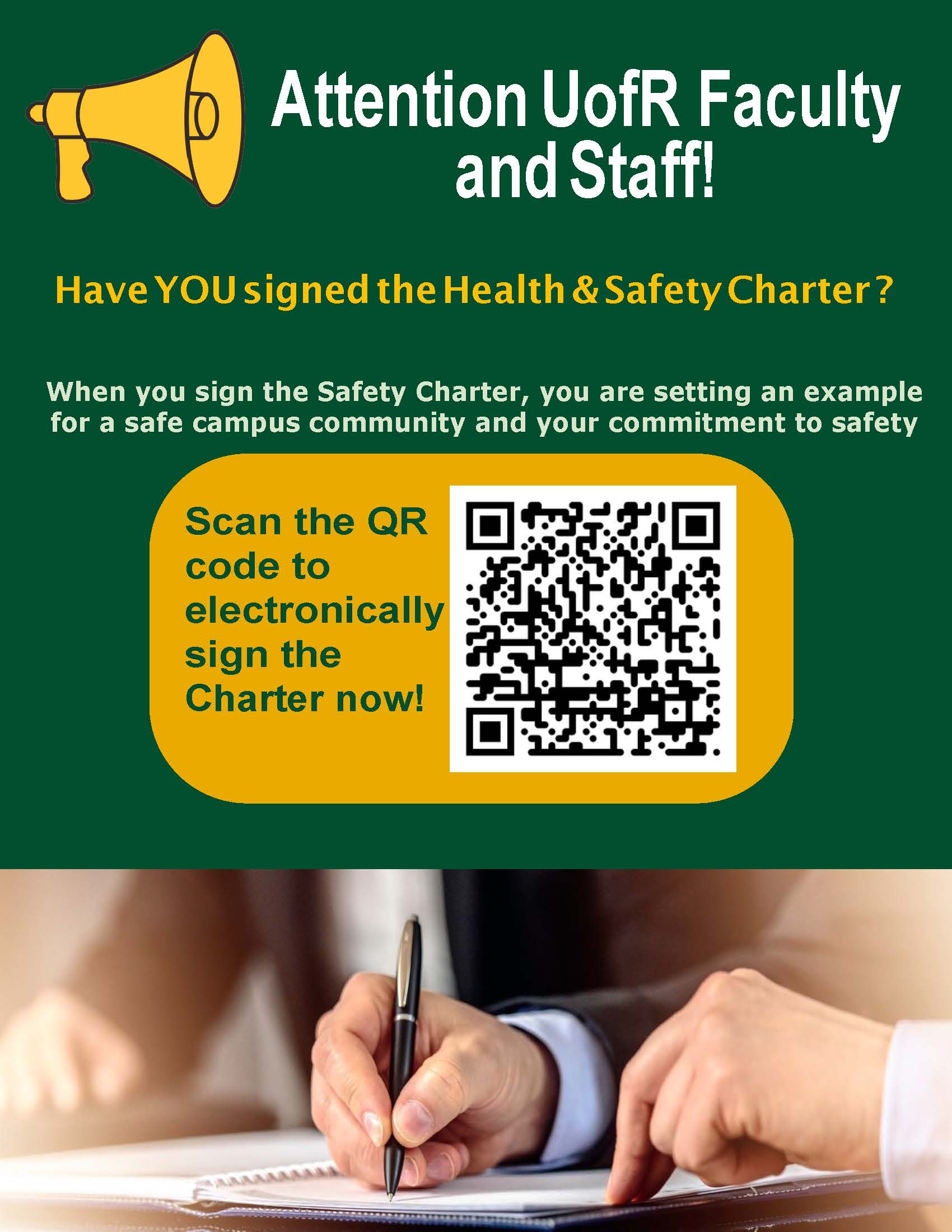 Safety is Everyone's Responsibility! Whether you are in a leadership or supervisory role (including Principle Investigators), faculty or staff, when you sign the Safety Charter declaration (UR Source), it acknowledges your participation and endorsement for safe learning and work. Each of us must take responsibility for our role in creating and supporting a safe institution.