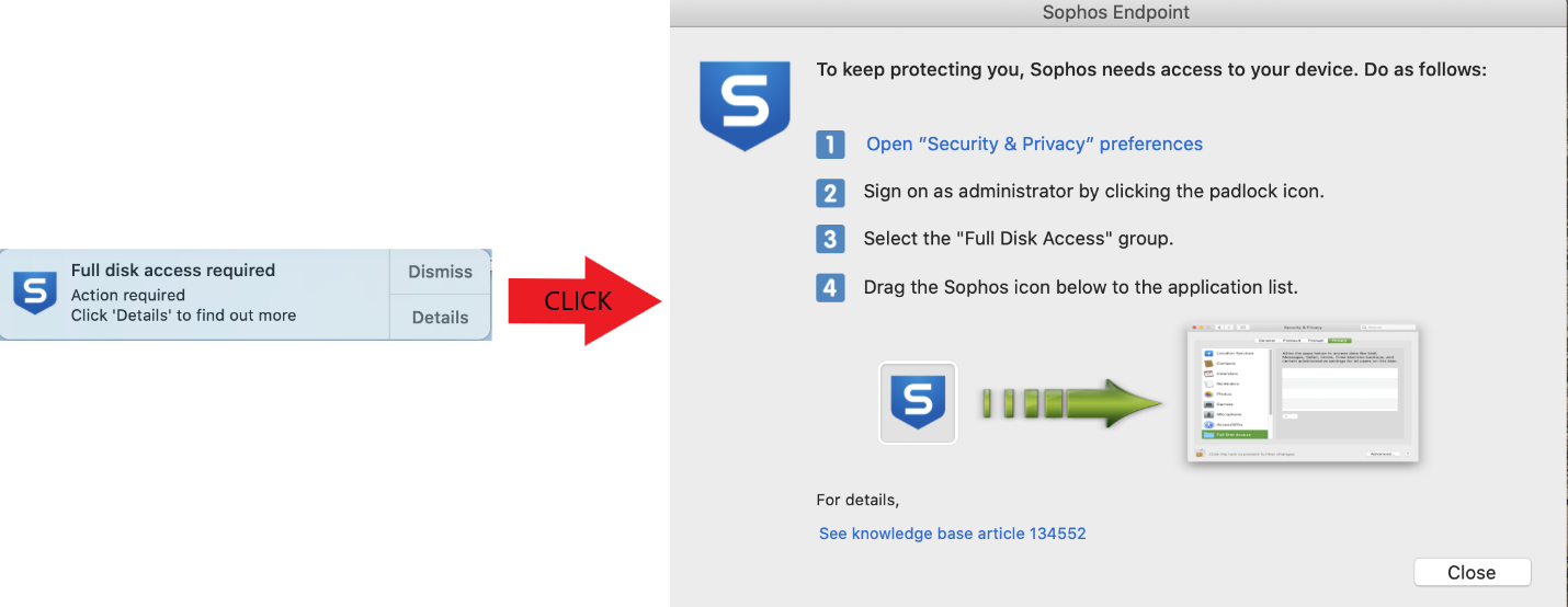 - The Sophos Full Disk Access required notification will appear. This is due to a new process required on Big Sur. This pop-up will occur (if Notifications are enabled) on install, and every 30 minutes if the permissions are detected as incorrect. Clicking on this notification will bring up a window that allows you to set permissions quickly.