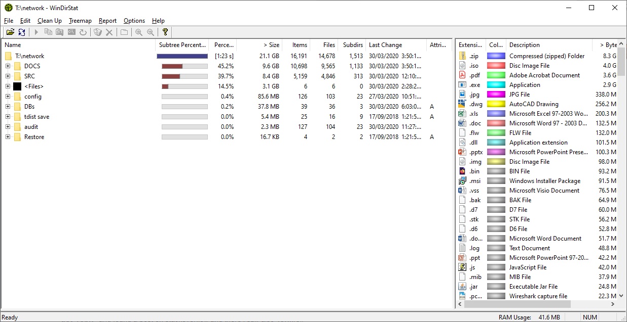 The scan results show the disk sizes of the sub-directories/files. Click on a sub-directory to check the sizes of the directoies under this sub-directory. You can also select "Treemap" from the menu items, then select "Show Treemap". The treemap represents each file as a colored rectangle, the area of which is proportional to the file's size. The rectangles are arranged in such a way, that directories again make up rectangles, which contain all their files and subdirectories. So their area is proportional to the size of the subtrees. The color of a rectangle indicates the type of the file, as shown in the extension list. The cushion shading additionally brings out the directory structure. After identifying the files to cleanup, you can right click to get the list of actions.