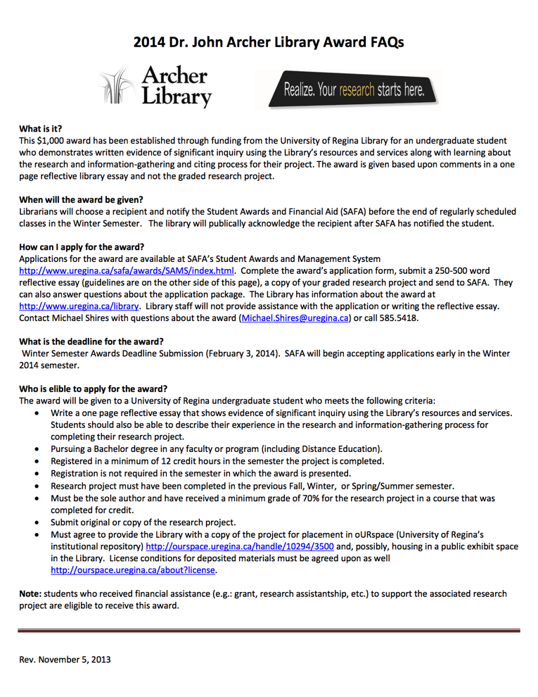 > Dr. John Archer Library Award for Best Undergraduate Research Project