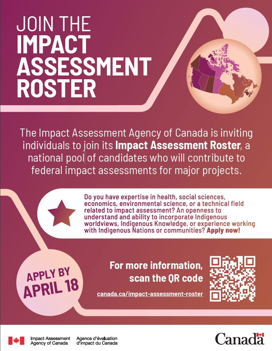 The Impact Assessment Agency of Canada is inviting individuals to join its Impact Assessment Roster, a national pool of candidates who will contribute to federal impact assessments for major projects. Do you have expertise in health, social sciences, economics, environmental science, or a technical field related to impact assessment? An openness to understand and ability to incorporate Indigenous worldviews, Indigenous Knowledge, or experience working with Indigenous Nations or communities? Apply now!