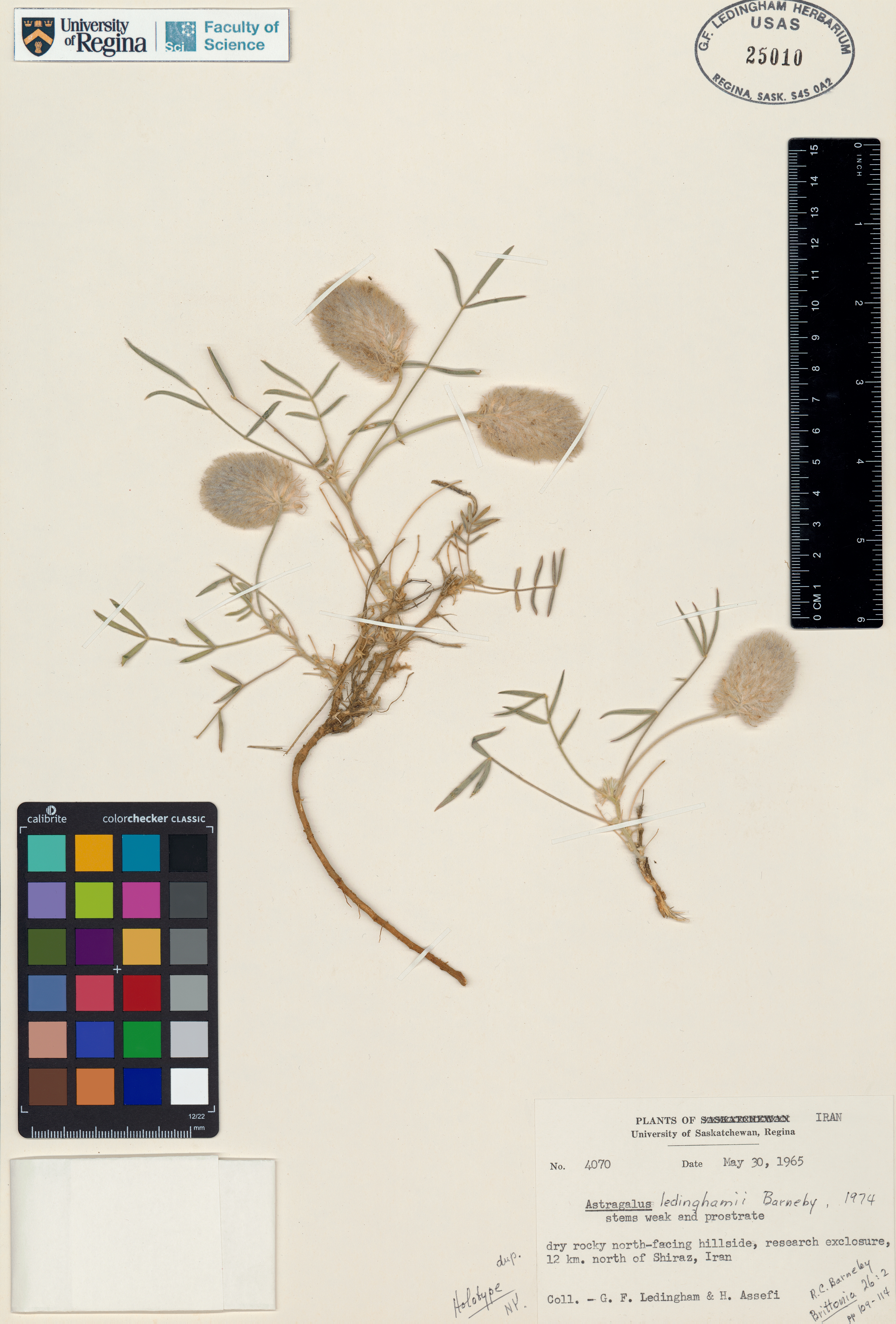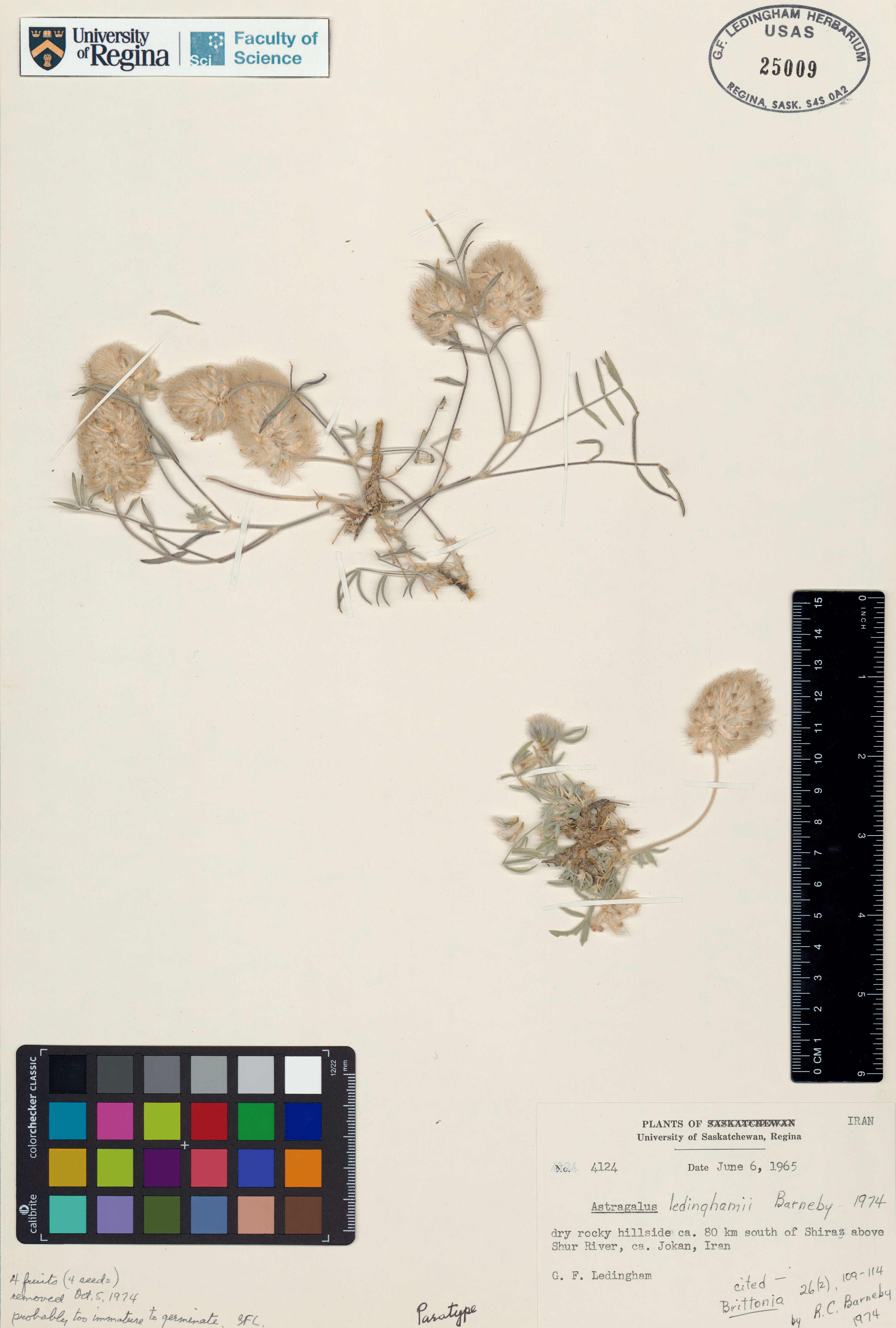 One George Ledingham's research interests the genus Astragalus, a member of the legume family (Fabaceae/Leguminosae). Members of this genus have a variety of common names, and are often referred to as "milk-vetches". There are a number of Saskatchewan members of this genus (and there are many accessions in the Herbarium), however this is a widespread genus and George made collecting trips in other parts of the world, including Iran in the 1960s.