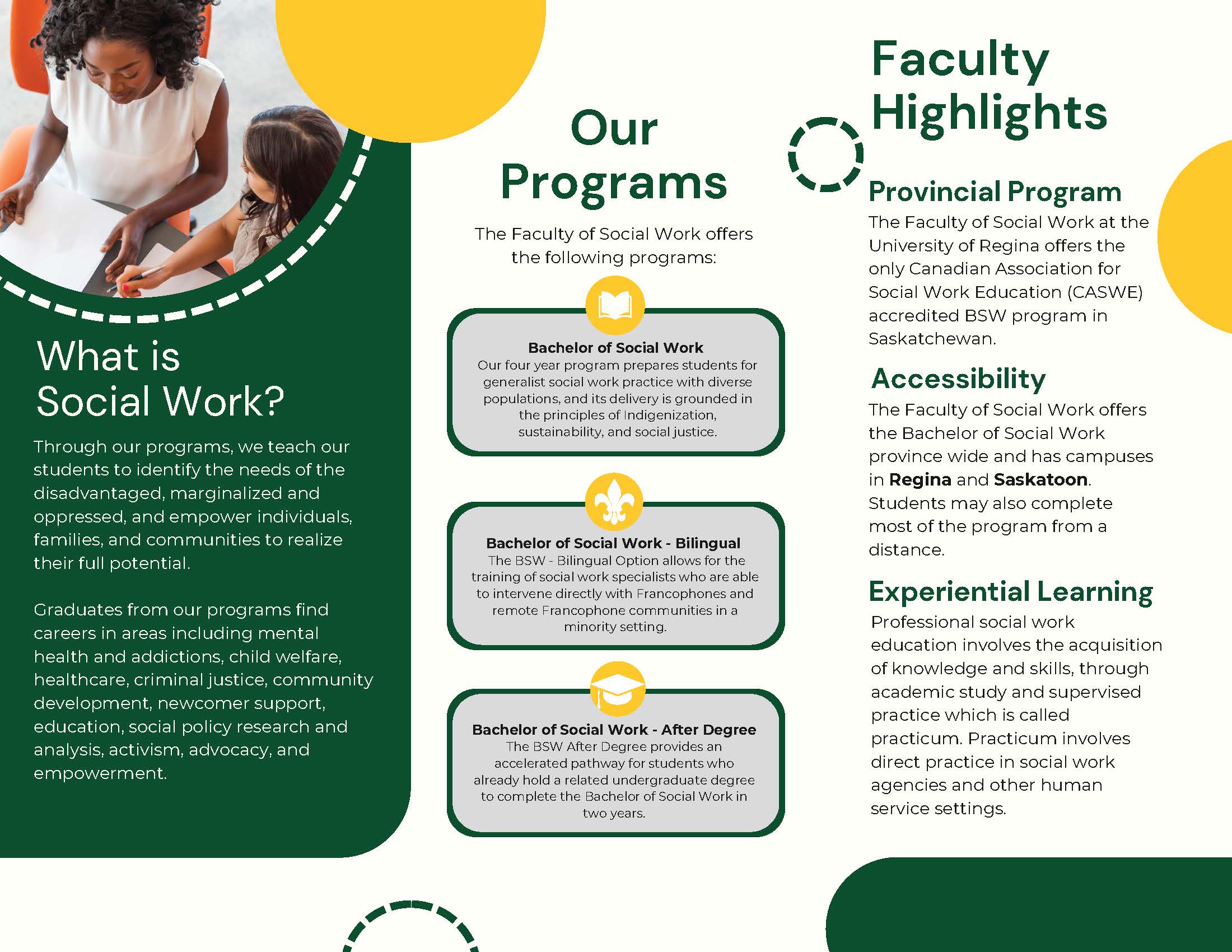 Off-campus courses (outside of Regina and Saskatoon) are offered throughout the province in cooperation with the Centre for Continuing Education and the regional colleges. Off-campus students should contact their local regional college for social work course information if they are interested in social work courses offered in their area.
