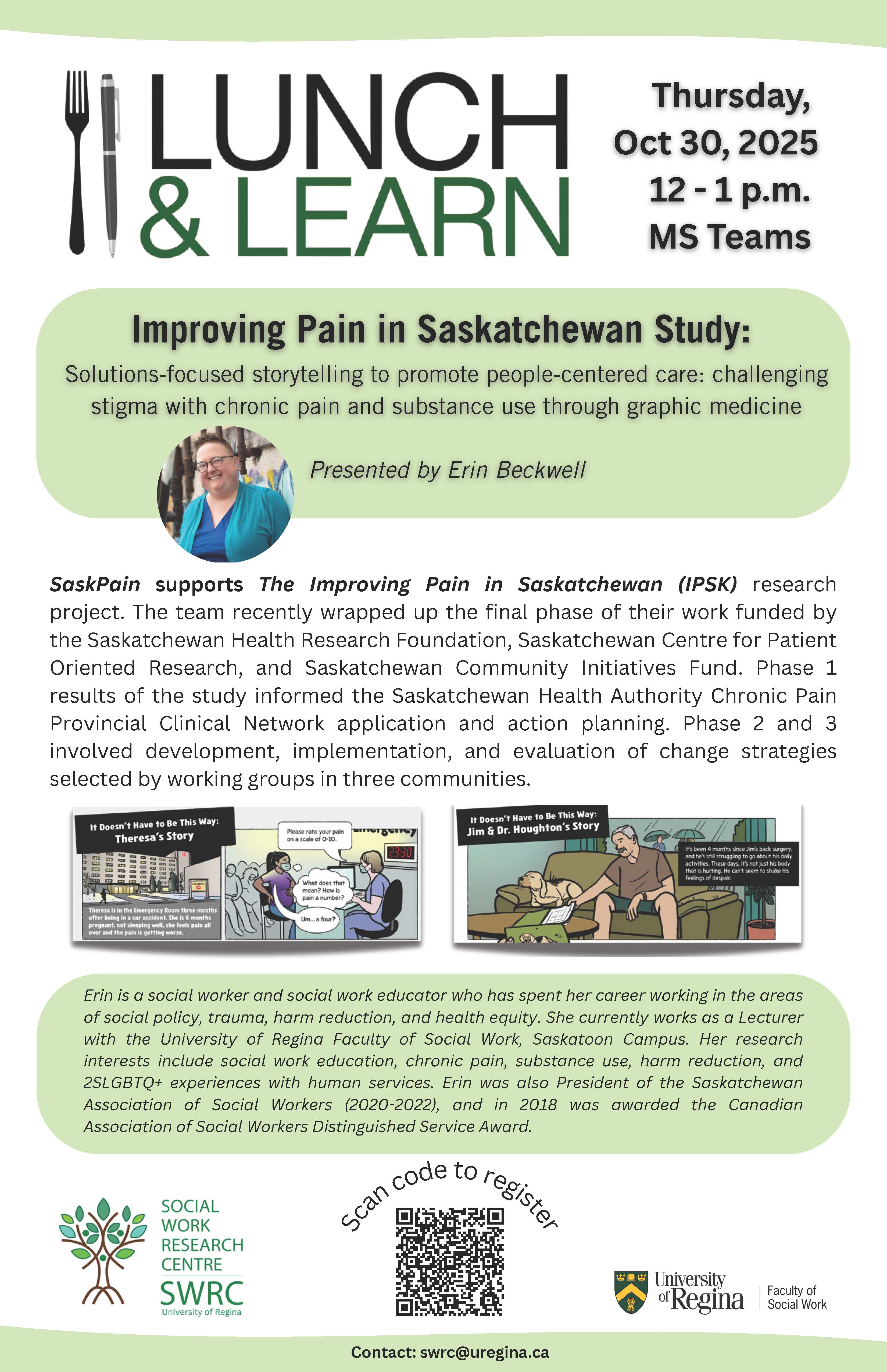 SaskPain supports The Improving Pain in Saskatchewan (IPSK) research project. The team recently wrapped up the final phase of their work funded by the Saskatchewan Health Research Foundation, Saskatchewan Centre for Patient Oriented Research, and Saskatchewan Community Initiatives Fund. Phase 1 results of the study informed the Saskatchewan Health Authority Chronic Pain Provincial Clinical Network application and action planning. Phase 2 and 3 involved development, implementation, and evaluation of change strategies selected by working groups in three communities.