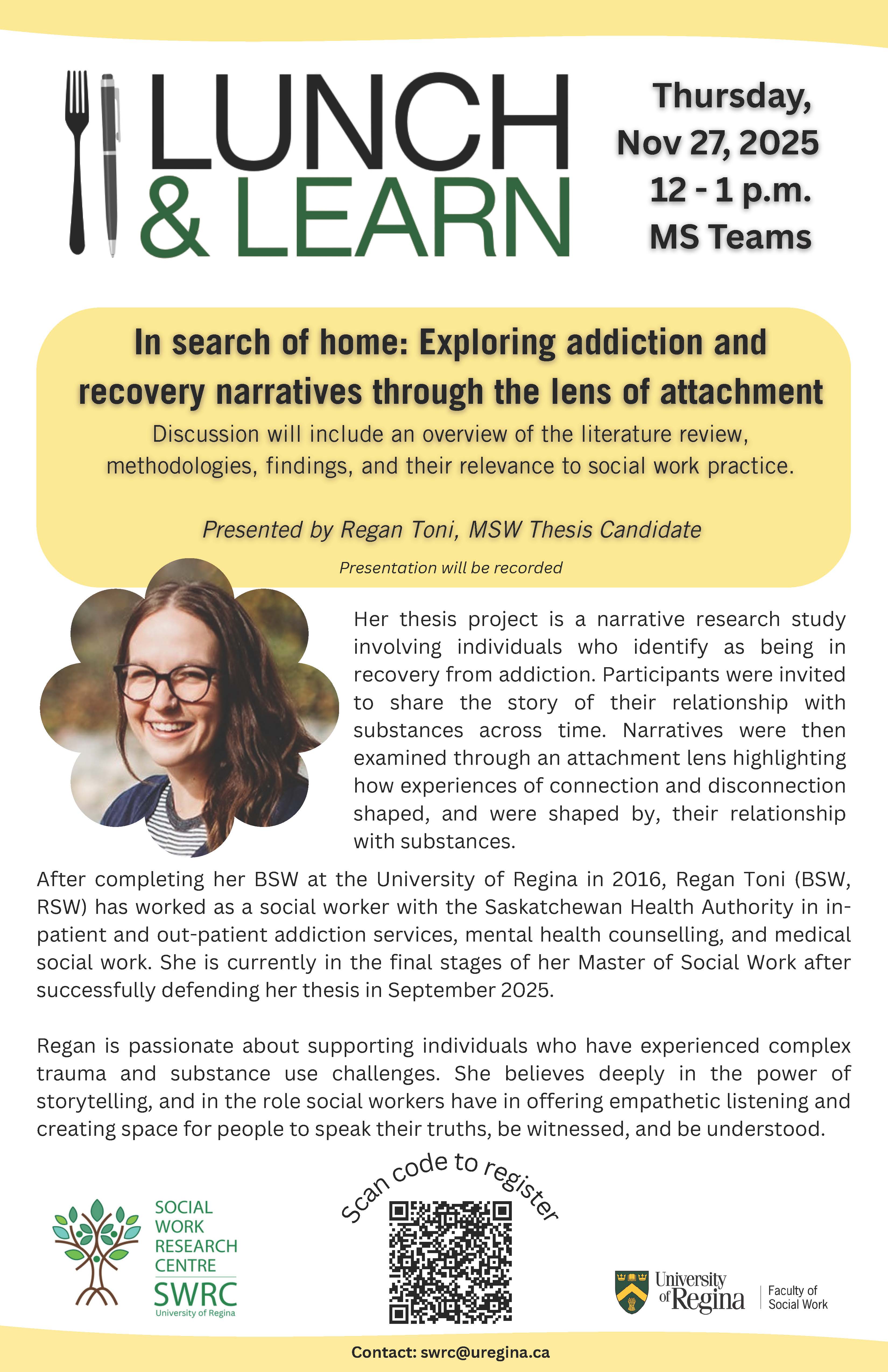 After completing her BSW at the University of Regina in 2016, Regan Toni (BSW, RSW) has worked as a social worker with the Saskatchewan Health Authority in inpatient and out-patient addiction services, mental health counselling, and medical social work. She is currently in the final stages of her Master of Social Work after successfully defending her thesis in September 2025. Regan is passionate about supporting individuals who have experienced complex trauma and substance use challenges. She believes deeply in the power of storytelling, and in the role social workers have in offering empathetic listening and creating space for people to speak their truths, be witnessed, and be understood.